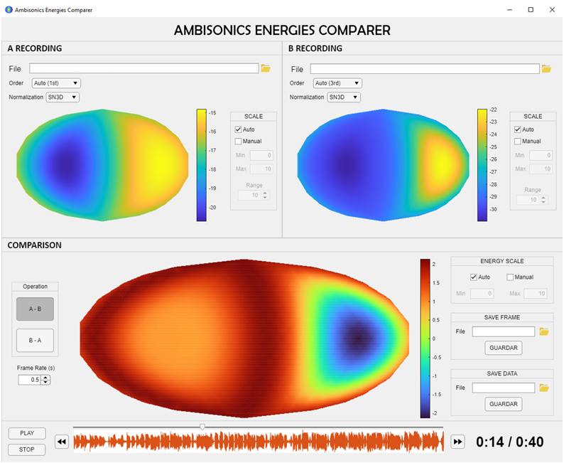 Ambisonics Energies Comparer is an app to compare two different Ambisonics signals, up to seventh order, in a visual way. Both signals, loaded as wav files, will be drawn by their energy distribution in an azimuthal equal-area projection: the Hammer projection.